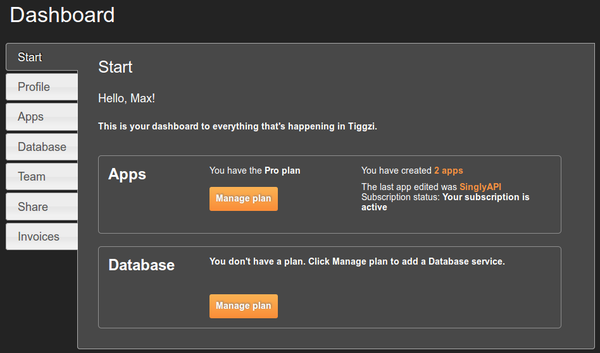 The new Dashboard page is informational dashboard into everything happening in Tiggzi, your plan information, and more: