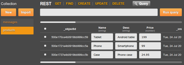 Creating a new service based on Tiggzi Database is very simple as each collection comes with a nice REST API hints: