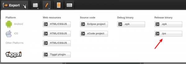 One of the really great features in Tiggzi mobile app builder is that you can quickly export the app as mobile Web, Android or iOS: