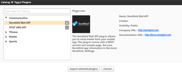 Click Import selected plug-ins button. You will be prompted to enter api_user and api_key values. Before being able to send out emails with SendGrid you need to sign up for an account (they do offer a free plan). You will then get a api_user and user_key. You may skip entering these values right now. You can always set them in Project/SendGrid_Settings.
