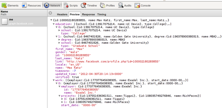 To test that we can make requests to Facebook’s Graph API, we can use the following REST service to get information about the logged in user:
