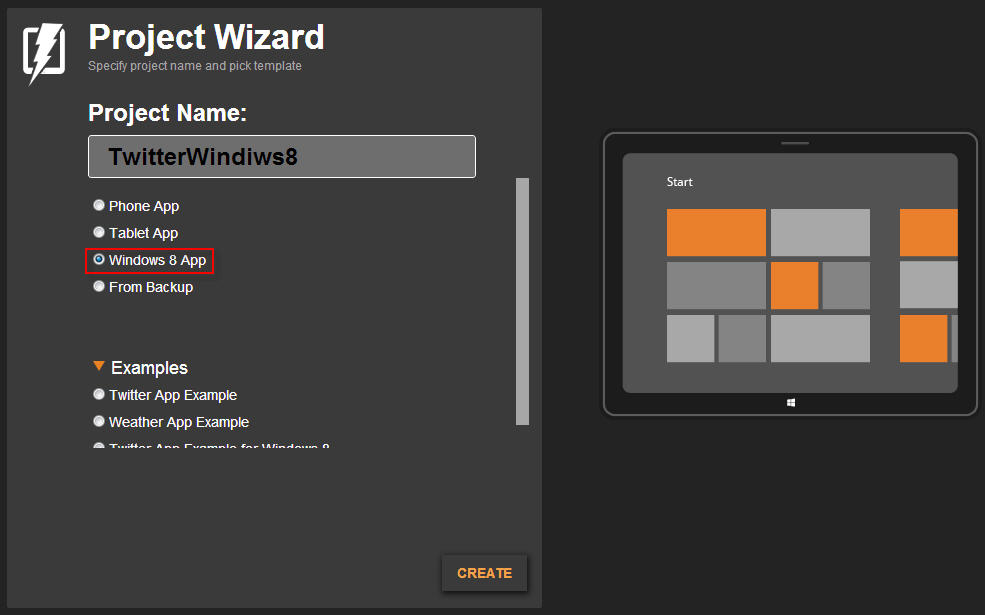 - Select the Windows 8 App radio button. (Windows 8 app support is only available in the new builder)