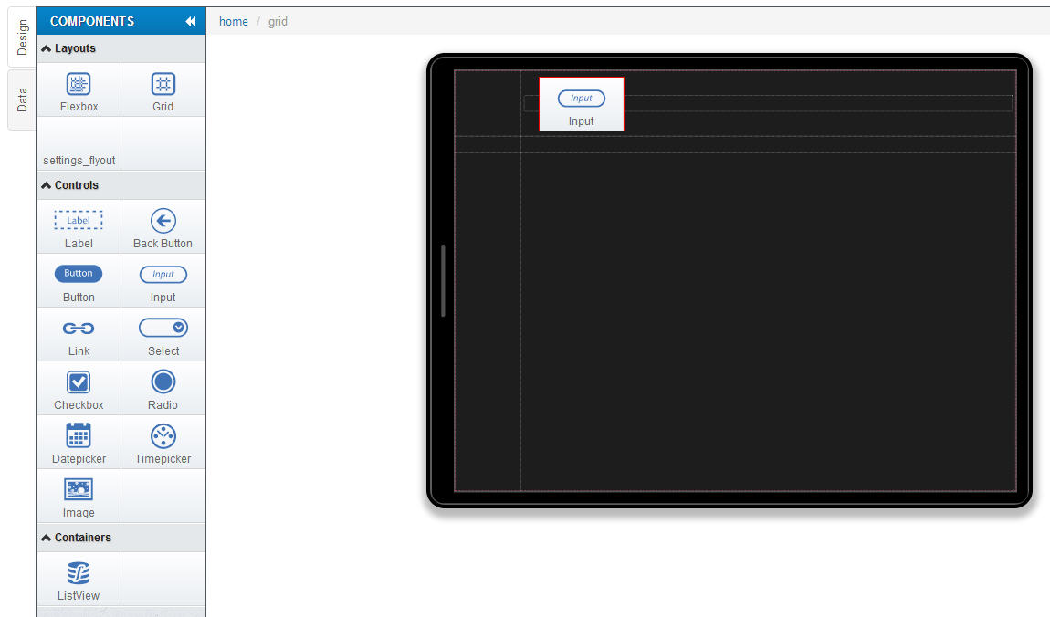 - From the Design components palette on the left, select an Input component under Controls and drop it inside the first row/second column cell. For the input component, change the name to query_input.