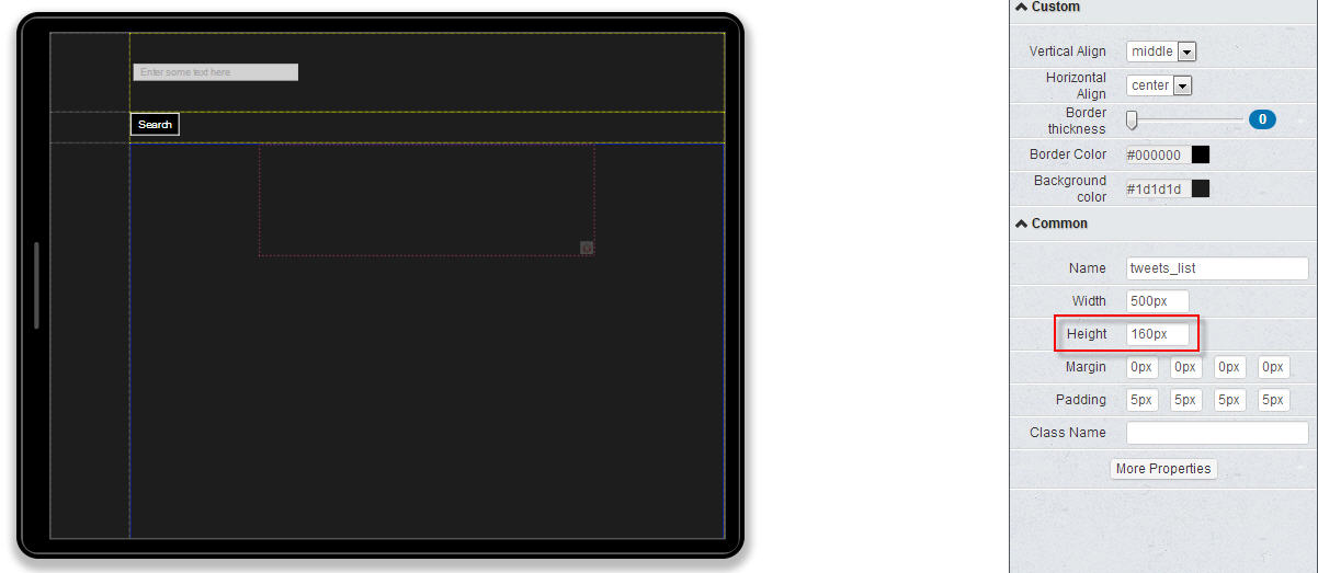 - Select the component and change the Height to “160px” under Common properties. Select a Grid component from the Layouts components and drop it inside the listview.
