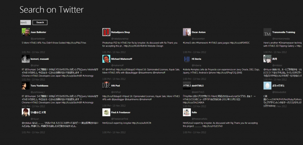This tutorial is going to show you how to build a Windows 8 app to search Twitter. The Twitter Search REST API will be used to find all tweets using a term entered in the app. The resulting app will be a native Windows 8 app, including support for the new “Modern UI” (aka Metro Style), with a Live Tile, support for Snap View, and the Windows 8 Search and Share charms. Before proceeding, keep this in mind: