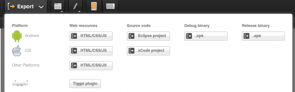 One of the really great features in Tiggzi mobile app builder is that you can quickly export the app as mobile Web, Android or iOS: