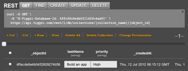 Creating a new service based on Tiggzi Database is very simple as each collection comes with a nice REST API hints: