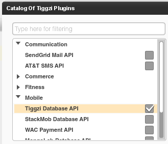 But there is even easier way to add a service by using Tiggzi Database API plug-in. From Project tab, click Create New > From Plug-in and select Tiggzi Database API plug-in: