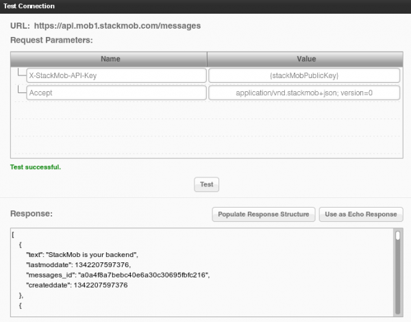 We get result back which means our service works (you should create a few sample objects in StackMob before testing). The service input is defined, we now need to define the service output. That can be done automatically by clicking Populate Response Structure button.