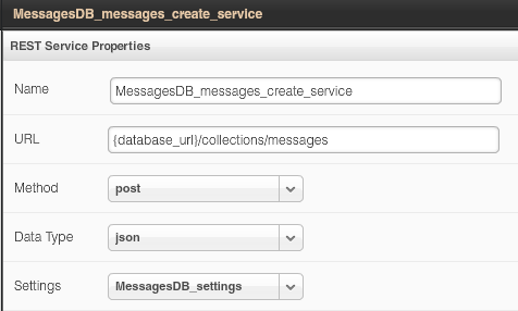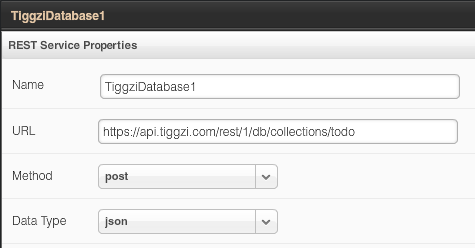 Integration with Tiggzi Database inside the app builder. When creating a new service, you will be able to point to any existing database collection that you created and auto-generate REST API services such as to display data, create data, or delete data.