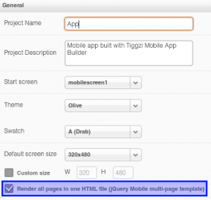 jQuery Mobile supports multi-page templates where two or more pages are placed inside the same file. You can now turn on this features in Tiggzi app builder (it’s turn off by default). Go to Project > Project Profile: