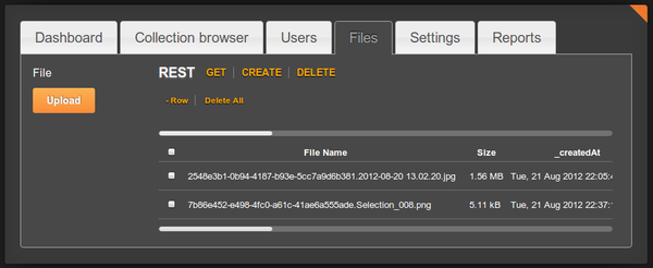 We continue to add new features to Tiggzi Backend Services by adding File API. You can now easily store files in the database. When you open any database, you will see a new Files tab: