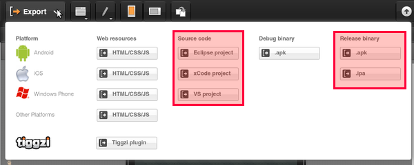 You can also easily export the app source for Android, iOS, and Windows Phone 7.
