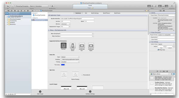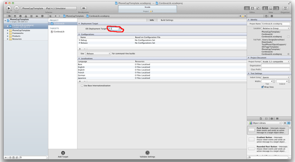 Change PhoneGapTemplate target settings: “Deployment Target” to 4.3
