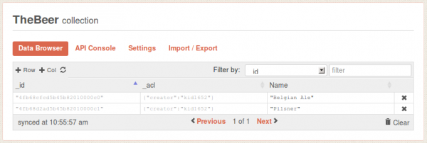 Open the collection. When you open it for the first time it will be empty so we need to define at least one column and enter some data. Click on +Col, and add Name column. Then add a few sample entries by clicking +Row. You can simply double click in Name column to enter values (you don’t need to enter anything for _id or _acl).