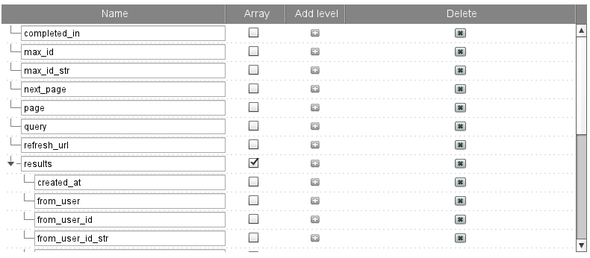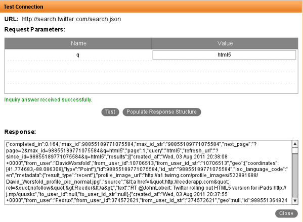 But, there is another very cool feature. Every service returns data and you need to define response parameters (which later can be mapped to components). Some services return many parameters and manually creating each parameter can be tedious. When you test the service there is Populate Response Button. When the button is clicked, all the output parameters from the service will be automatically created. Here is how it looks using Twitter’s search URL (http://search.twitter.com/search.json?q=html5):