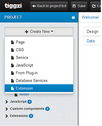 - Open Projects > Create New and select Extensions from the drop-down list.