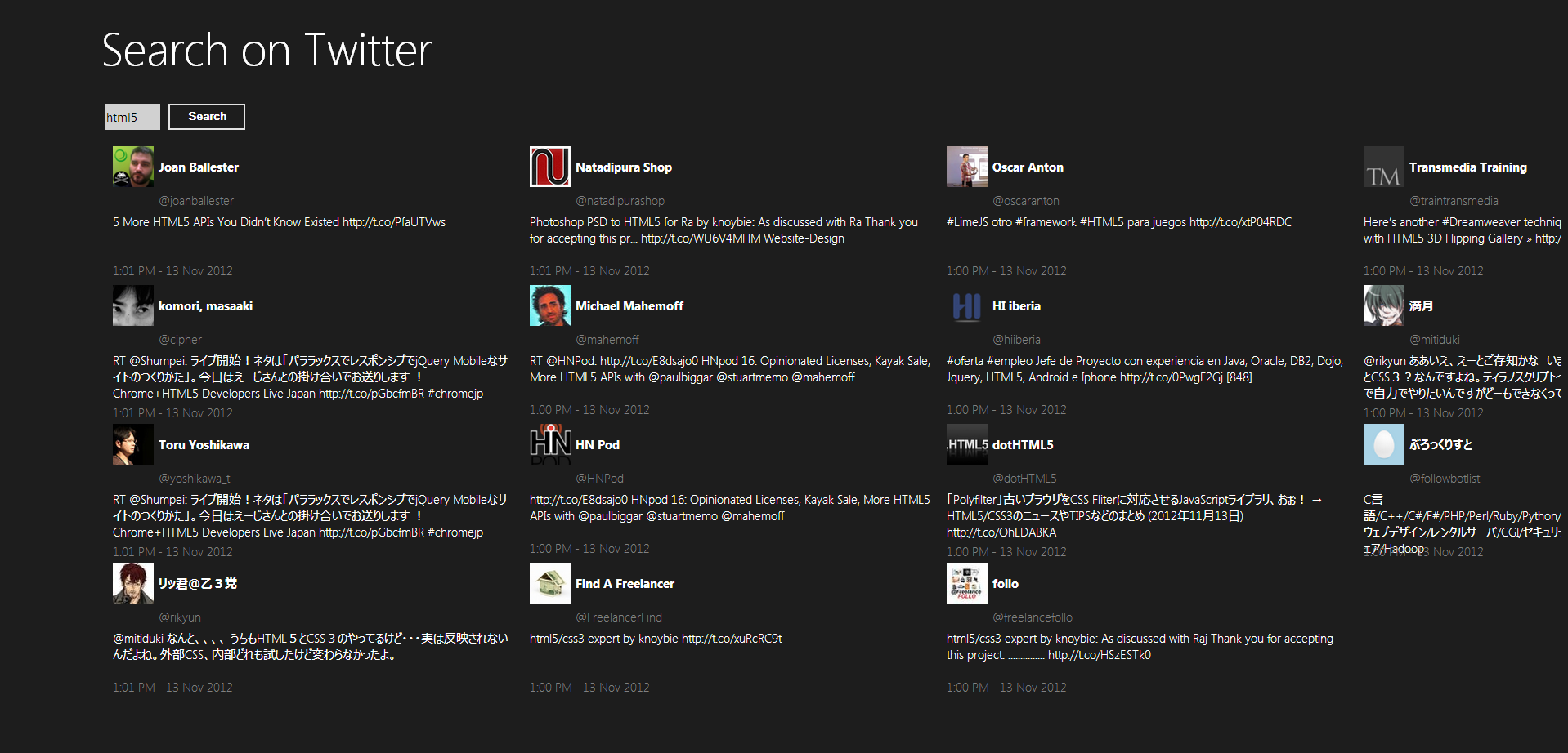 This tutorial is going to show you how to build a Windows 8 app to search Twitter. The Twitter Search REST API will be used to find all tweets using a term entered in the app. The resulting app will be a native Windows 8 app, including support for the new “Modern UI” (aka Metro Style), with a Live Tile, support for Snap View, and the Windows 8 Search and Share charms. Before proceeding, keep this in mind: