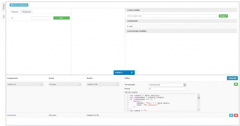 Once the REST service parameters and the UI components have been created, you will now need to connect them together in the Data section of the editor.