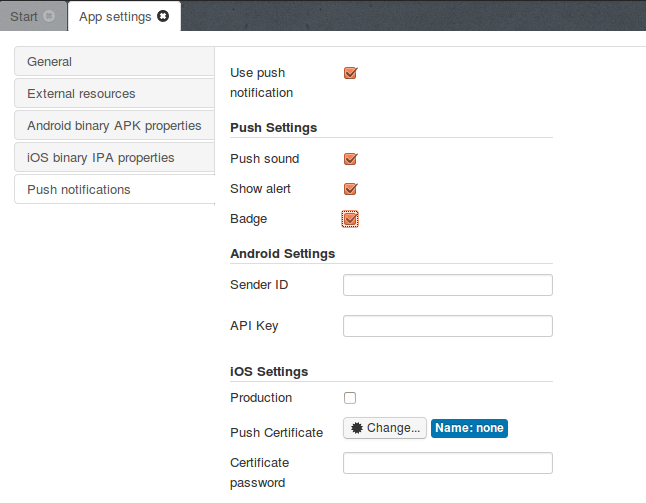 - In Push notifications tab in Tiggzi, check Production check box if application is in Distribute stage, otherwise leave it unchecked