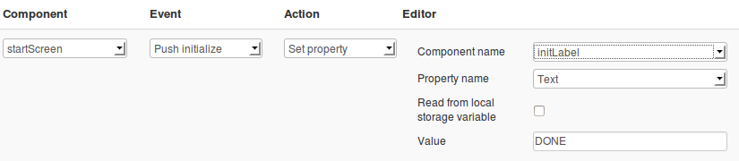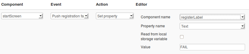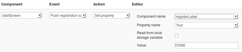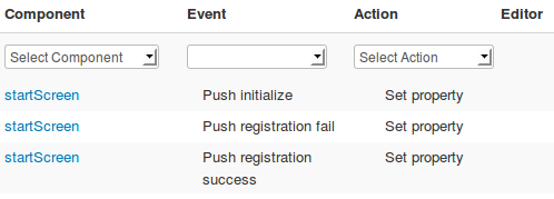 - We need to add one more event. Select startScreen as component, Push notification in Event and Run JavaScript for action. Enter the following code: